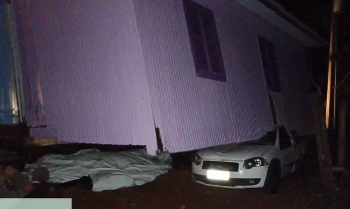 A estrutura deslocada pelo vendaval ficou apoiada parcialmente sobre o veículo, que permanece embaixo da casa até a manhã deste domingo, 21. A retirada deve ser realizada assim que as condições do tempo permitirem.
