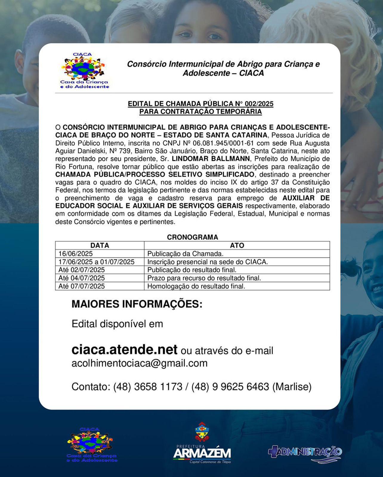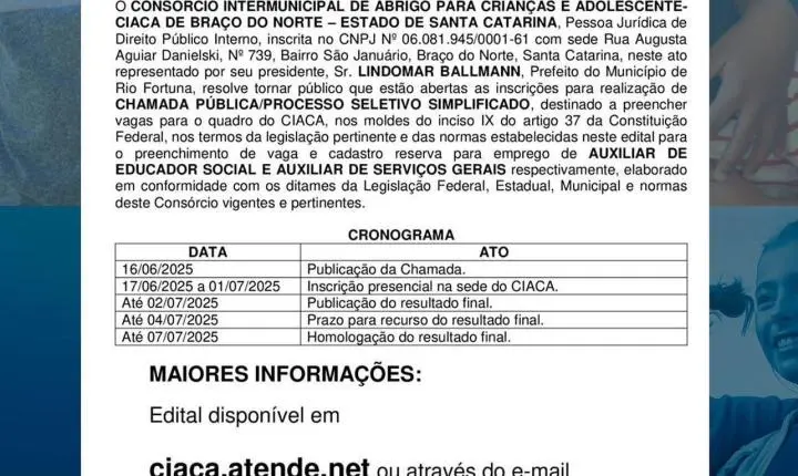 Estão abertas as inscrições para a realização de Chamada Pública/Processo Seletivo Simplificado do Consórcio Intermunicipal de Abrigo para Crianças e Adolescentes (Ciaca).
