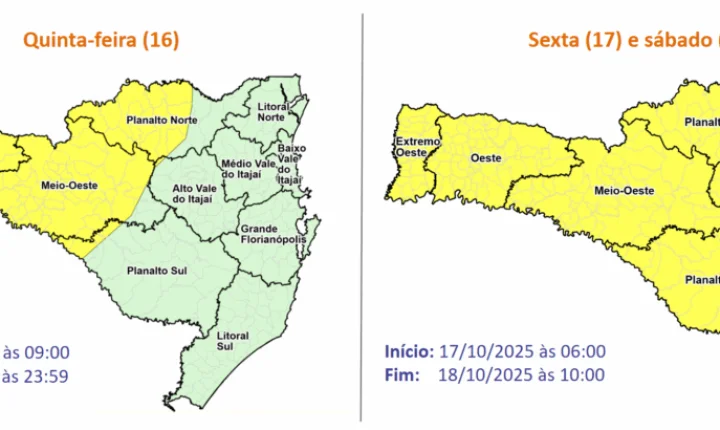 A instabilidade começa na manhã de quinta-feira, 16, pelo Oeste e áreas de divisa com o Rio Grande do Sul, avançando para as demais regiões ao longo do dia. Os temporais mais fortes devem ocorrer no Grande Oeste e Planalto Norte, com possibilidade de raios, rajadas de vento e queda de granizo.