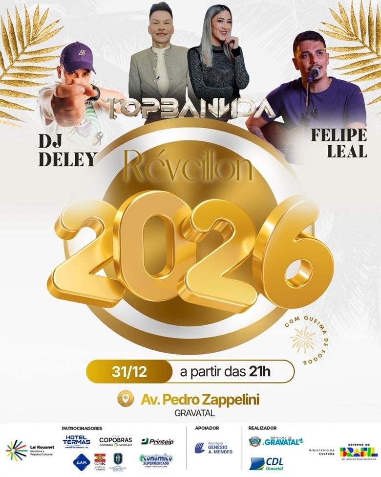 Já no dia 31 de dezembro, Gravatal se despede de 2025 e recebe o novo ano com uma grande festa de Réveillon, também na Avenida Pedro Zappelini. A partir das 21h, a virada será animada pelo DJ Deley, pelo grupo Top Banda e pelo cantor Felipe Leal.
