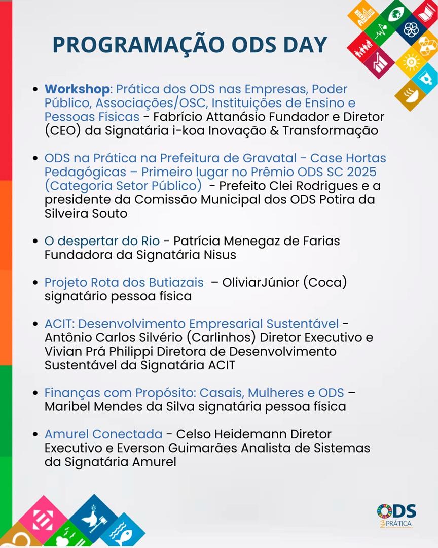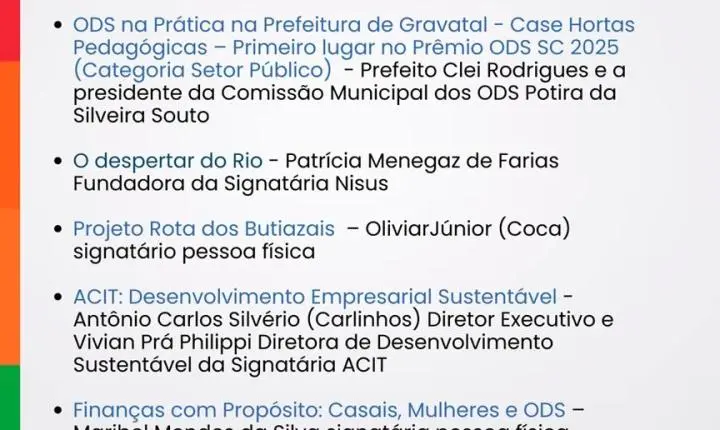 Entre os momentos mais aguardados está a apresentação do projeto Hortas Pedagógicas, da Prefeitura de Gravatal, vencedor do Prêmio ODS SC 2025 na categoria Setor Público, durante o Fórum Brasil ODS em Joinville. A iniciativa integra práticas de educação ambiental, alimentação saudável e sustentabilidade nas escolas do município, servindo como case de sucesso para outras cidades.
