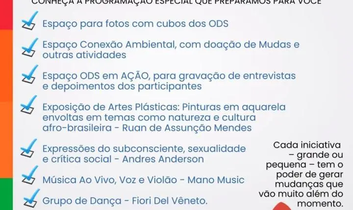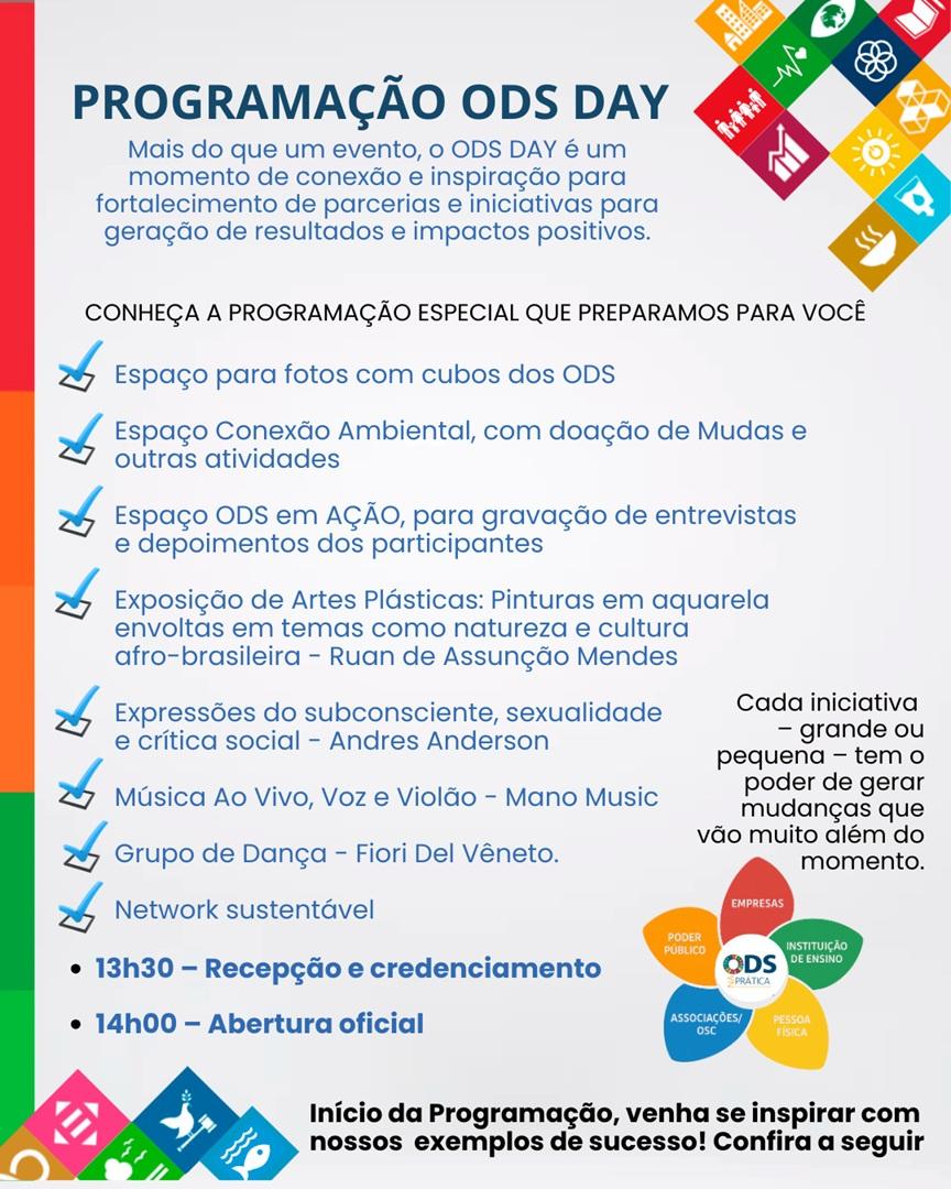 Além de palestras e workshops, o ODS Day terá exposição de artes plásticas com Ruan de Assunção Mendes e Andres Anderson, apresentações musicais e de dança com Mano Music e o Grupo Fiori Del Vêneto, além de atividades de conscientização ambiental e espaço para networking.