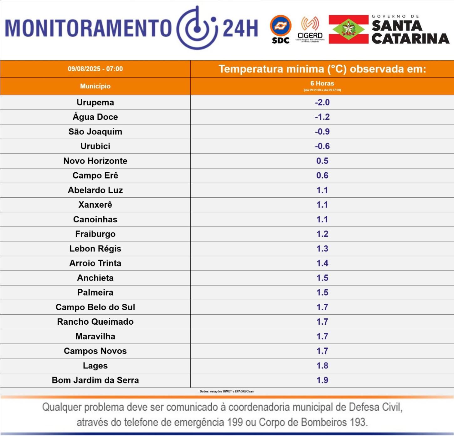 Desde a última quinta-feira (7), a Secretaria da Proteção e Defesa Civil do Estado havia alertado para a possibilidade de precipitação invernal — neve e/ou chuva congelada — na região. Em São Joaquim, os termômetros chegaram a marcar -1°C nas primeiras horas deste sábado, em Urupema, a mínima chegou a -2ºC.