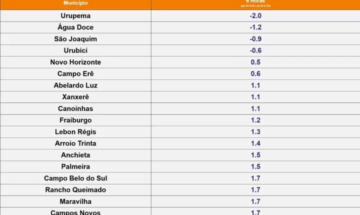 A próxima madrugada será marcada por frio intenso em Santa Catarina. Apesar do tempo firme e da ausência de condições para neve, o amanhecer deve ser de geada abrangente em grande parte do estado. As temperaturas mínimas ficarão entre 0°C e 4°C em várias regiões, podendo atingir valores negativos nos Planaltos.